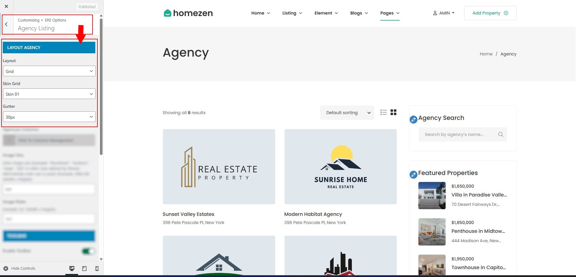 - In Dashboard Admin, Navigate to: Appearance » Customize » ERE Options » Agency Listing
