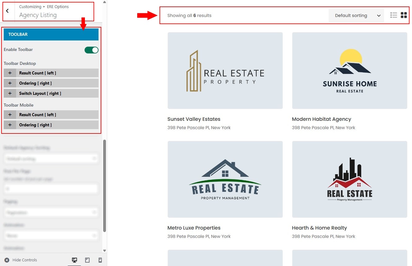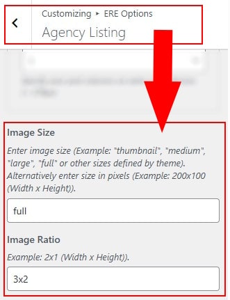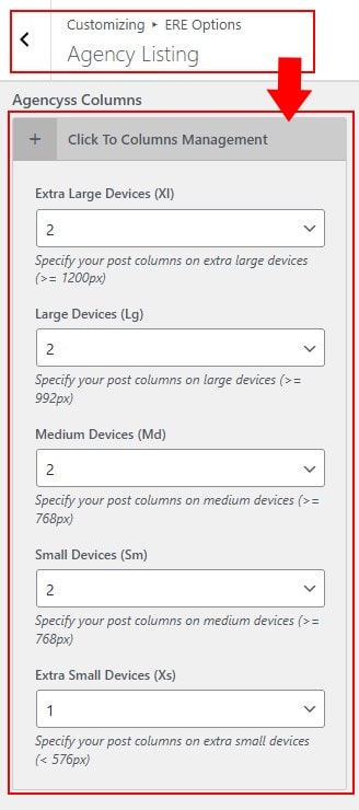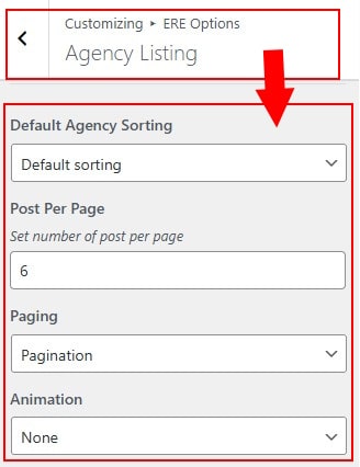 - In Dashboard Admin, Navigate to: Appearance » Customize » ERE Options » Agency Listing
